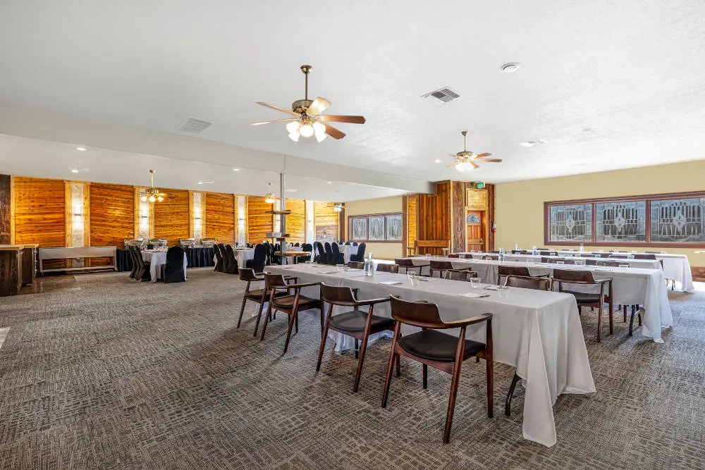 Host your next gathering in our beautifully appointed Notaras Hall at Soap Lake resort. Where rustic warmth meets functional elegance. Featuring rich wood-paneled walls, natural light, and an open, flexible floor plan. This space is ideal for weddings, retreats, meetings, reunions, and special celebrations. Designed to comfortably accommodate both intimate gatherings and larger groups. The room easily adapts to banquet style dining, workshops, corporate meetings, or celebratory events. Whether you’re planning a business retreat, wellness weekend, or milestone celebration. Our Notaras Hall provides a charming, versatile setting in the heart of Soap Lake. Call us today to set up a tour or to speak to our event team. Let’s make your next event unforgettable at our Notaras Hall.