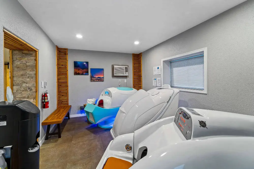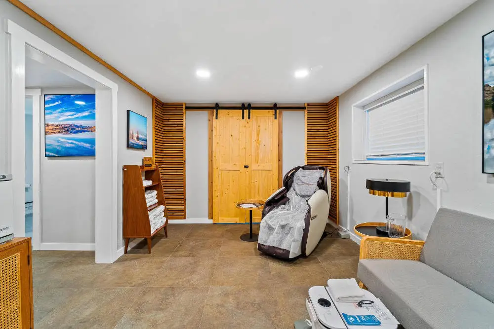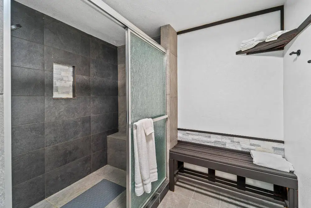 A spacious dry sauna, glowing with gentle infrared heat, up to a group of 15 guests